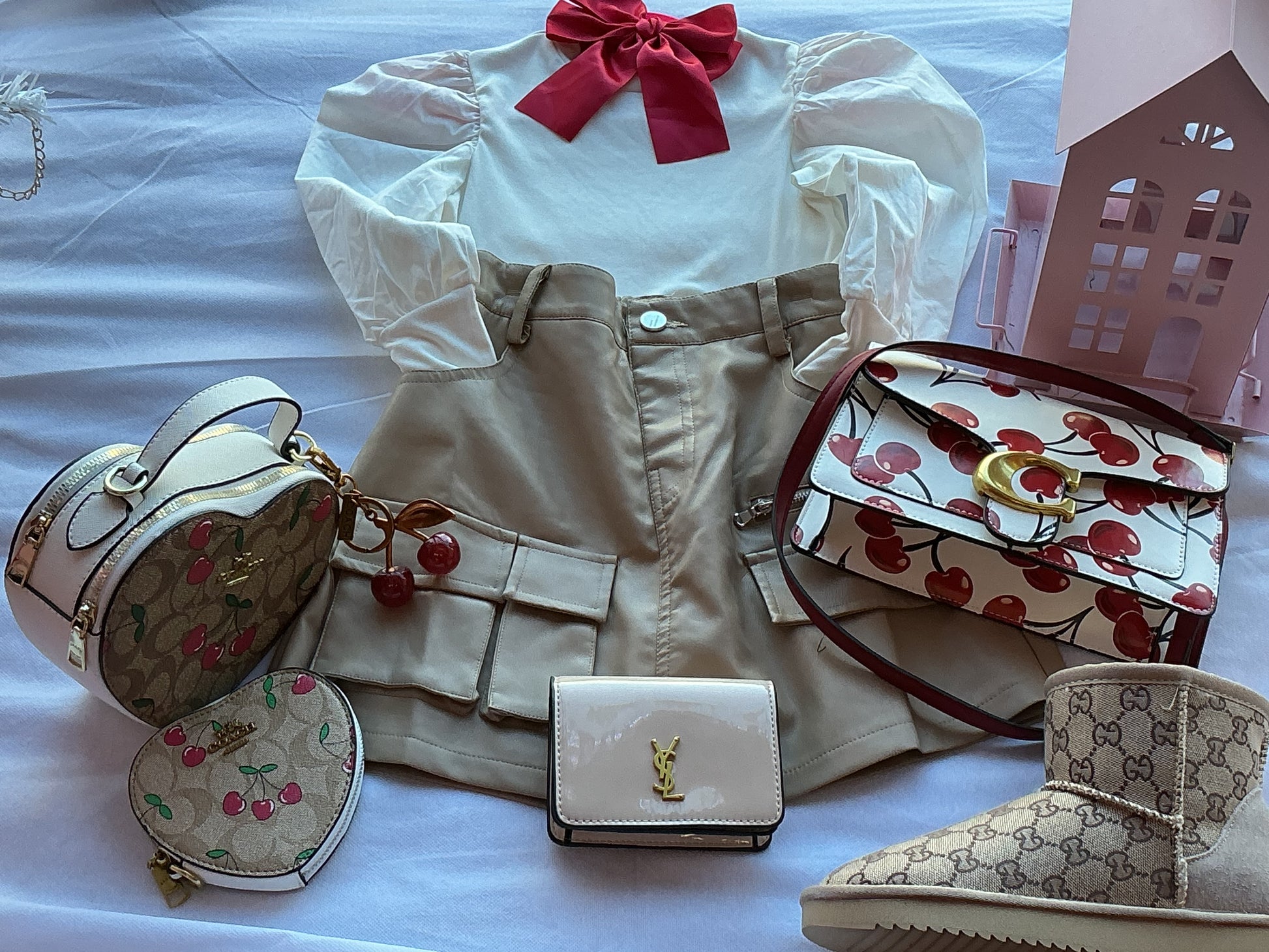 Pocket Polly is a cute Tan skirt with pocket throughout the front of the skirt paired with a white rib blouse. Purse and shoes are sold separately.