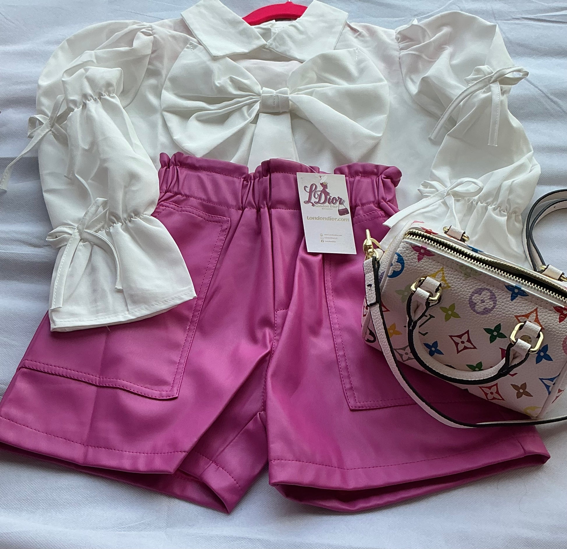 Sassy with A Bow is just a pair of Pink Pu Leather Shorts with a white long sleeve bow shirt.